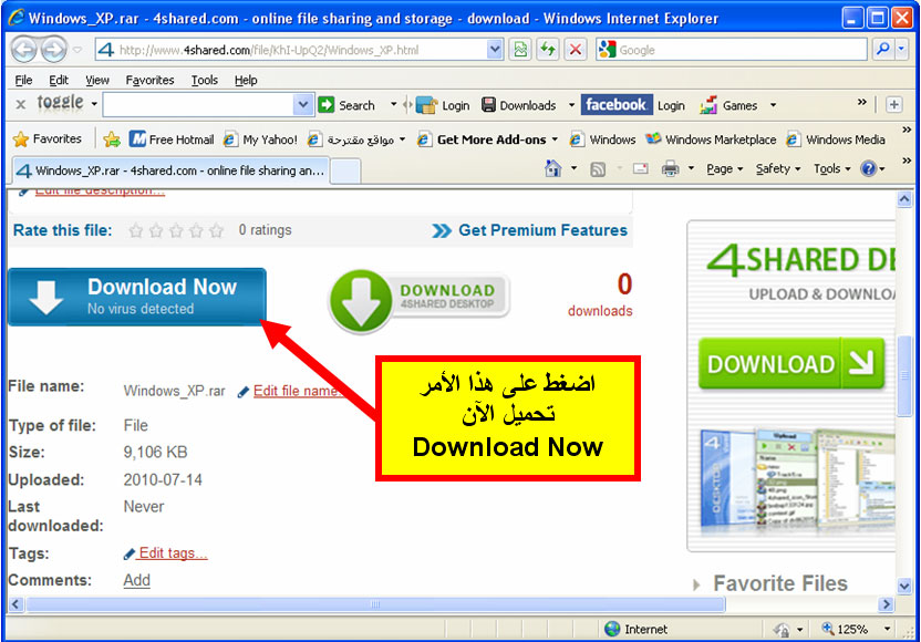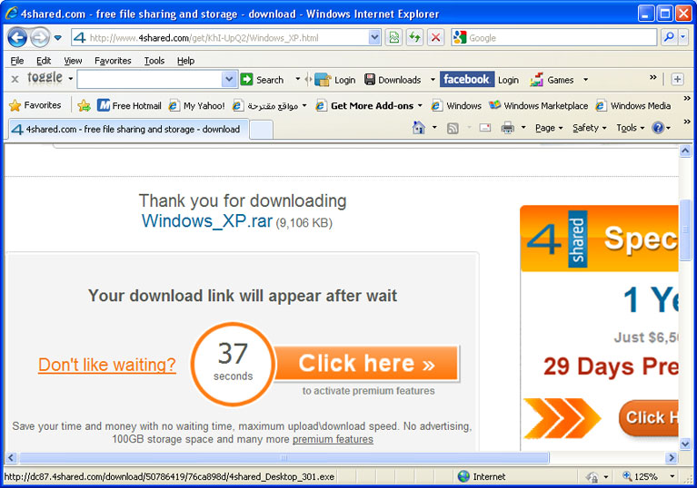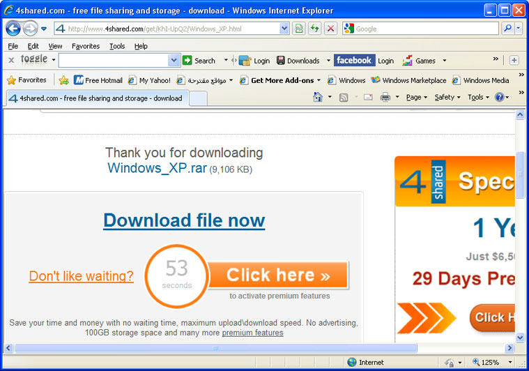 | تعليمات تحميل الملفات تم رفع جميع ملفات الموقع على موقع تحميل ملفات اخر هو موقع 4shared لان الموقع المستضيف لا يسمح بتحميل ملفات كبيرة كما أن أقصى حجم للملفات هو 40 ميجا لذا تم تحميل جميع الملفات على موقع 4shared عند الضغط على الملف المراد تحميله تظهر نافذة جديدة لصفحة بموقع 4shared وهو من مواقع تحميل الملفات الموجودة على الانترنت وأريد توضيح اننى غير مسئول عن الإعلانات الموجودة بموقع التحميل 4shared لان الموقع يقوم بتقديم دعاية بصفحاته نظير خدمة تحميل الملفات الموجودة لدية. النافذة تشبه النافذة التالية